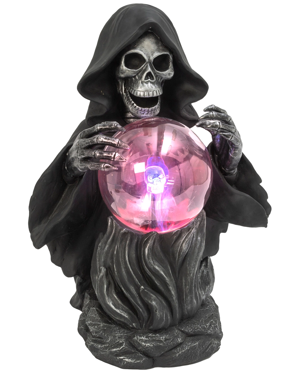 Gevatter Tod schaut in die Glaskugel. Was er wohl sieht? Stellt unseren eindrucksvollen beleuchteten Sensenmann mit Kugel auf dem Tisch und fragt euch, warum der Grim Reaper so fröhlich aussieht. Das kann doch nichts Gutes bedeuten für euch, oder? Ob er wirklich die Zukunft voraussagt? Und warum ist sie lila? Fragen über Fragen, die man vielleicht gar nicht unbedingt beantwortet haben will.