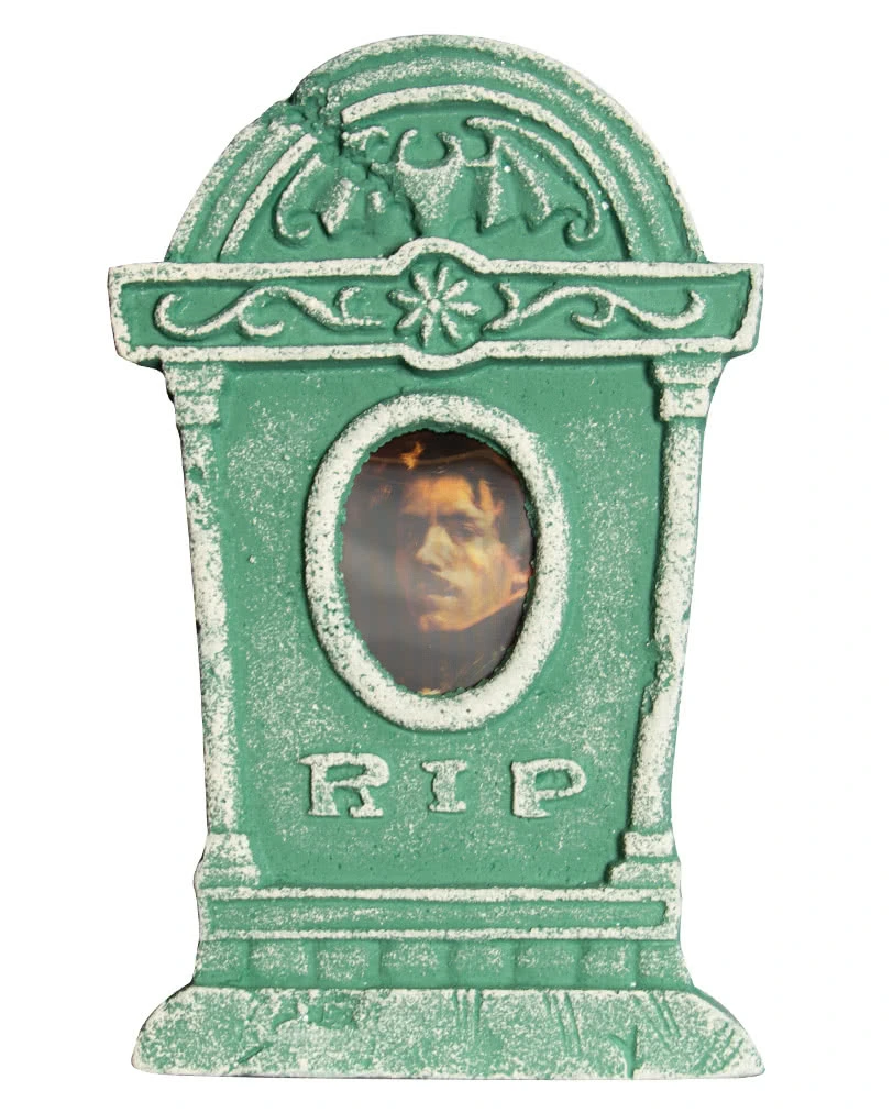 Mit diesem Hologramm Grabstein siehst Du dem Zahn der Zeit bei der Arbeit zu. Das Portrait des Toten verwandelt sich vor deinen Augen in einen Schädel. Der Styropor Grabstein hat ein ovales Portrait des Verblichenen in der Mitte, das mit Hologramm Technik beim Bewegen den Entschlafenen in seinem aktuellen Zustand zeigt. Lasst alle Hoffnung fahren, sagt uns dieser Deko Grabstein, denn das Ende kommt bestimmt und auch für dich.