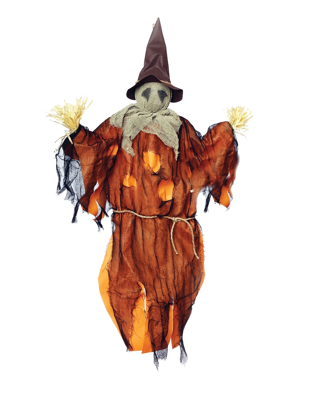 Die hängende Vogelscheuche mit Stroh Orange weist eine Größe von ca. 90 cm auf. In Form und Proportionen entspricht die Halloween-Hängedeko in etwa klassischen Strohmännern. Ein oranges, mit Flicken übersätes Gewand wird von einem einfachen Strick um die „Hüften“ zusammengehalten und unterstreicht in Verbindung mit stilisiertem Stroh anstelle der Hände die realistische Optik der Halloween-Deko. Mittels Schnüren und Bändern lässt sich die Strohpuppen-Deko unkompliziert an Nägeln, Schrauben o.ä. aufhängen und befestigen. Dazu passen ein Schwarze Krähe Deluxe 43 cm und ein Spinnennetz schwarz 100cm.