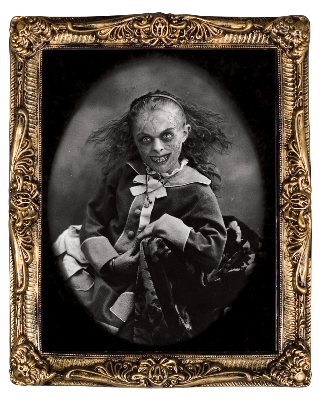Das Zombie Mädchen Wackelbild ist ein gerahmtes Bild, das im ersten Moment ein süßes Mädchen zeigt. Durch den „Wackeleffekt“ verwandelt sich das Mädchen in ein furchteinflößendes Zombie-Kind mit ekelhafter Fratze und abstehenden Haaren. Die Halloween Wanddekoration ist 33 x 38 cm groß und ideal für den Innenbereich. Das Zombie Mädchen Wackelbild ist nur eines von außergewöhnlichen Halloween Deko-Artikeln aus unserem Onlineshop. Bei uns findest du auch ein Bewegliches Wandbild Gruslige Hexe oder das unheimliche Effektbild Horror Zwillinge 38 x 51 cm